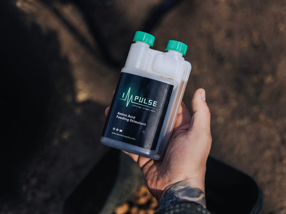 Impulse liquid is one of our most versatile products. Simply put, Impulse liquid provides the angler a simple and cost-effective way to get Impulse into the feeding area. This can most easily be achieved via a number of popular applications, the most common of which being wetting either groundbait or micro / expander pellets with a 10:1 dilution of impulse liquid. Simply add ~40 mL of Impulse liquid to 400 mL of water, using this mixture to wet groundbait or pellets. This ratio holds for lower or higher volumes, with, for example, ~20 mL Impulse added to 200 mL liquid being appropriate for smaller volumes of bait.